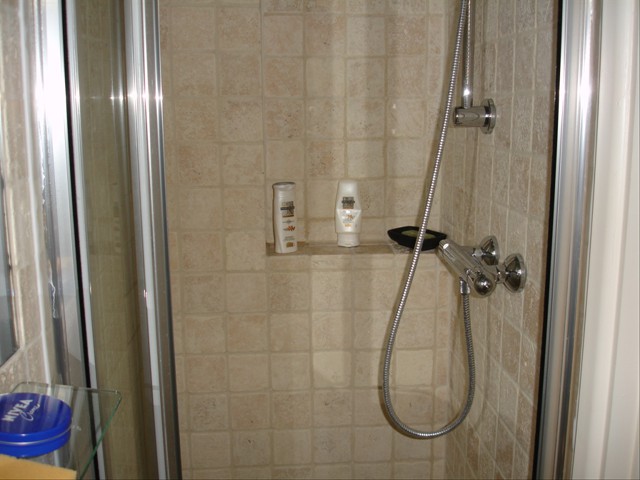 An alcove beside the shower for towels and ledge inside the cubilcle for toiletries and more shoulder space.